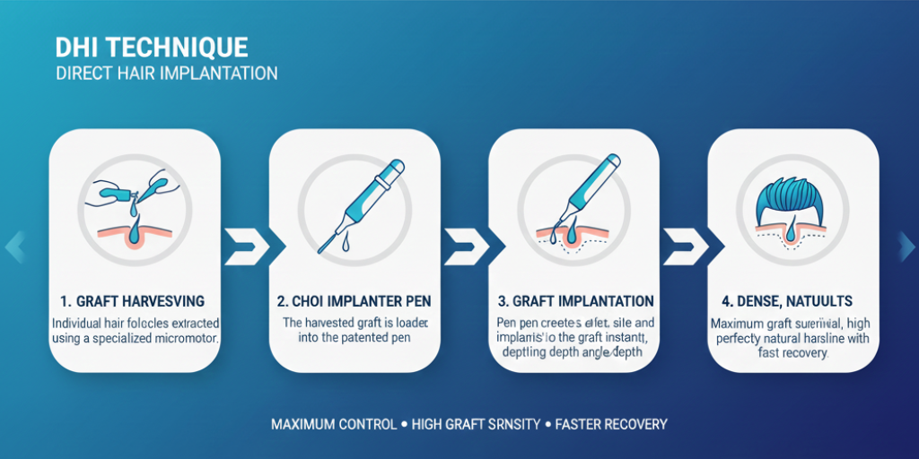 The DHI Technique uses a specialized implanter pen to place hair follicles directly into the scalp. It offers greater control, resulting in a more natural hairline and improved density. This method reduces handling of grafts, ensuring higher survival rates. Patients benefit from minimal scarring, faster recovery, and a comfortable procedure.
