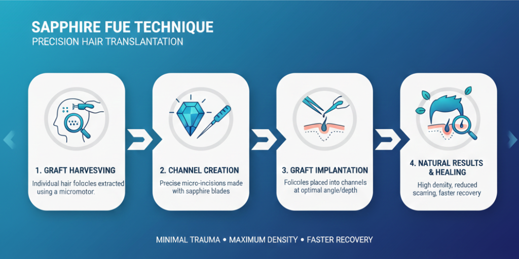 The Sapphire FUE Technique uses ultra-fine sapphire blades for precise and gentle hair follicle placement. It offers less scarring, reduced bleeding, and faster healing compared to traditional methods. This technique also provides higher density and a more natural-looking hairline. Patients enjoy a comfortable procedure with better overall results.